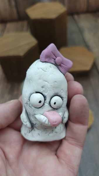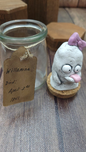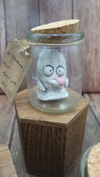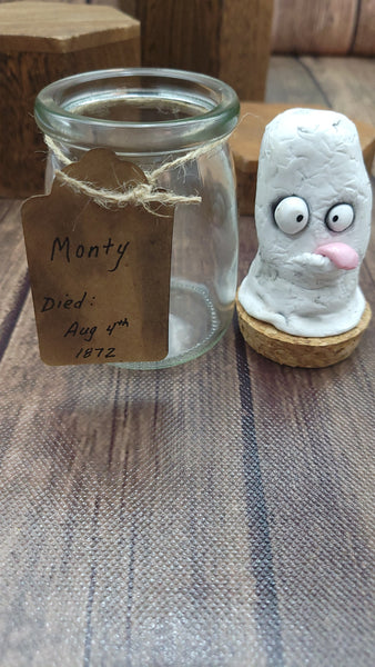 Ghost in a Jar , is a little ghost that was caught n jarred up ! They are @ 2" tall and come in a 3 1/2" jar with a tag on them with the Ghosts name and the day they died and became a ghost ! They will NOT be glued down like similar characters in jars , in case you want to take them out , but if you want it glued down , please make a note in the order instructions and I will gladly glue the ghost inside the jar , there are 26 available and no 2 are exactly the same . They are sculpted from polymer clay and are durable but can break if mishandled .This listing is only for 1 piece , multiples are pictured just for examples of some of the faces available