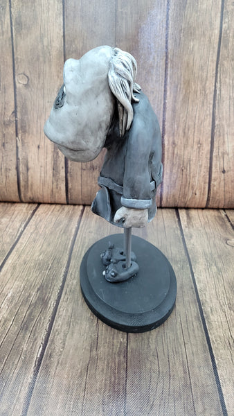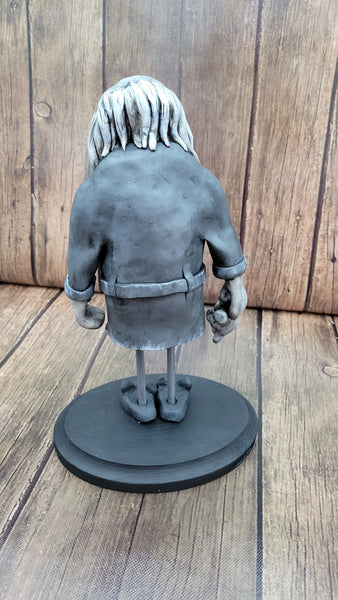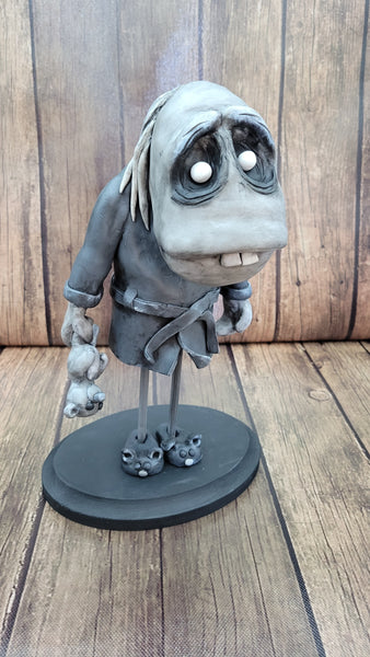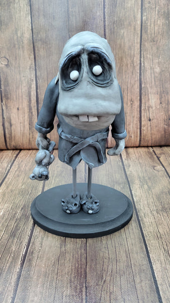 Stanley is a member of a whimsical dark alt reality , hes mounted on a 7" wood stand , w the stand he stands @ 11" tall . He is made from durable polymer clay but can break if mishandled , he is not a toy He is a OOAK