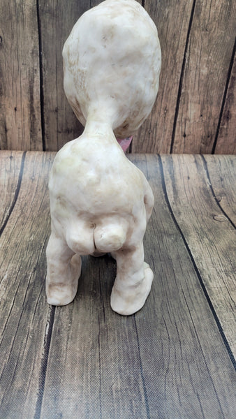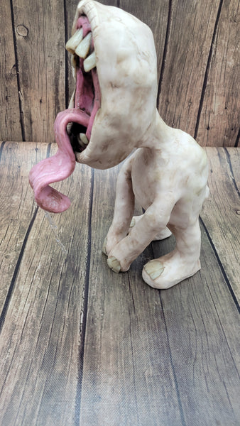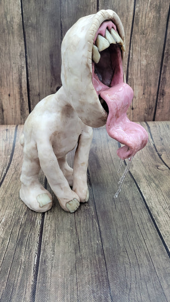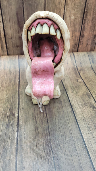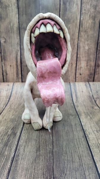 Tongue and Cheeks Drools is 11 " h x 5 " w x 6" d . He is made of durable polymer clay but can break if mishandled. This is not a toy.